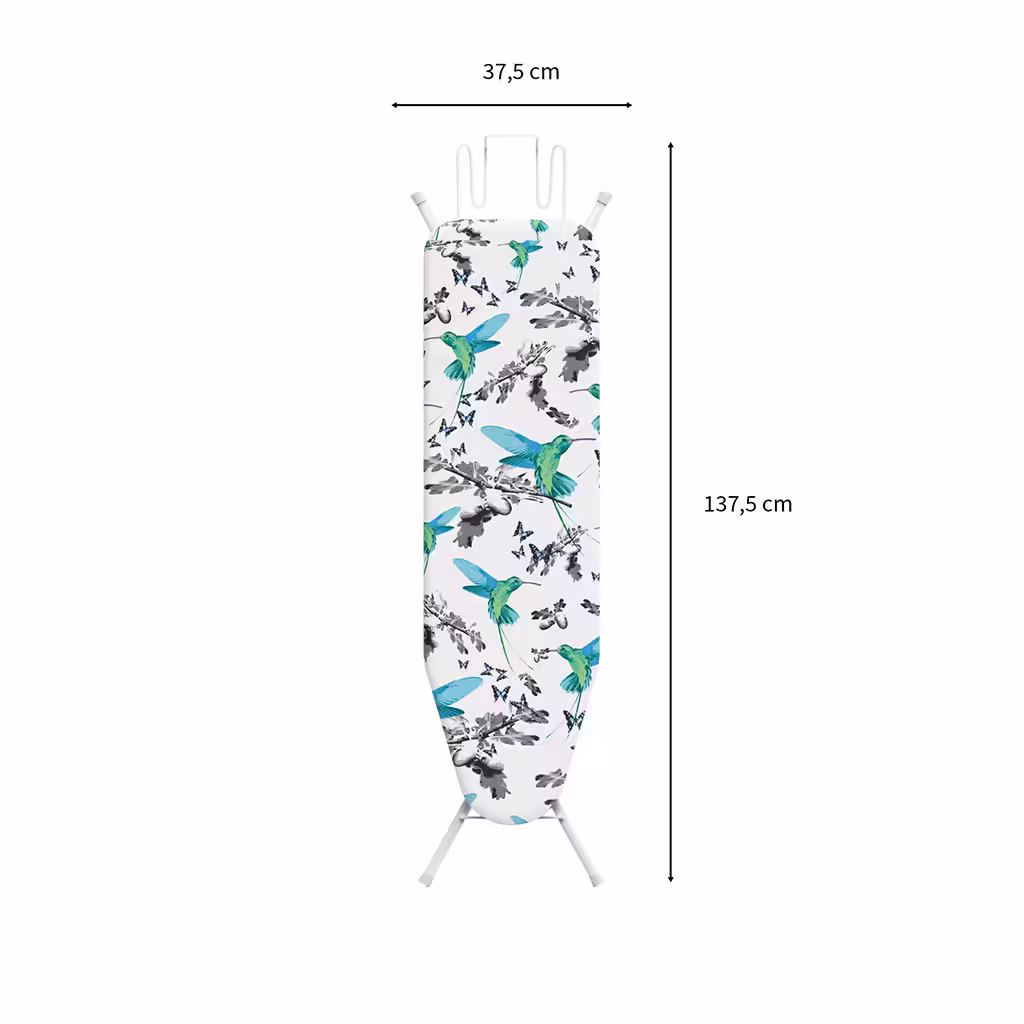 Practical ironing board with height adjustment in for different positions. Equipped with iron rest and foldable and lockable stand.