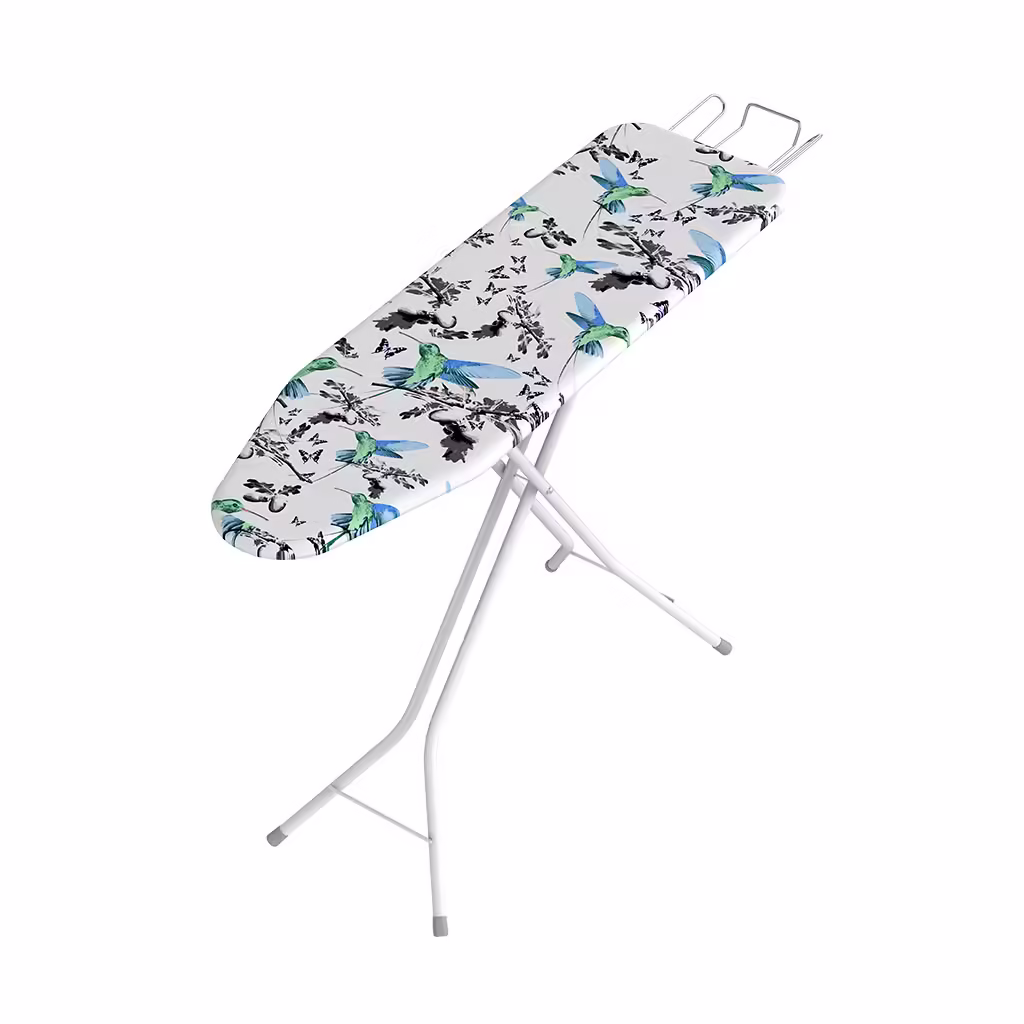 Simple and convenient ironing board equipped with a wire iron holder, height adjustment, and a lockable frame.